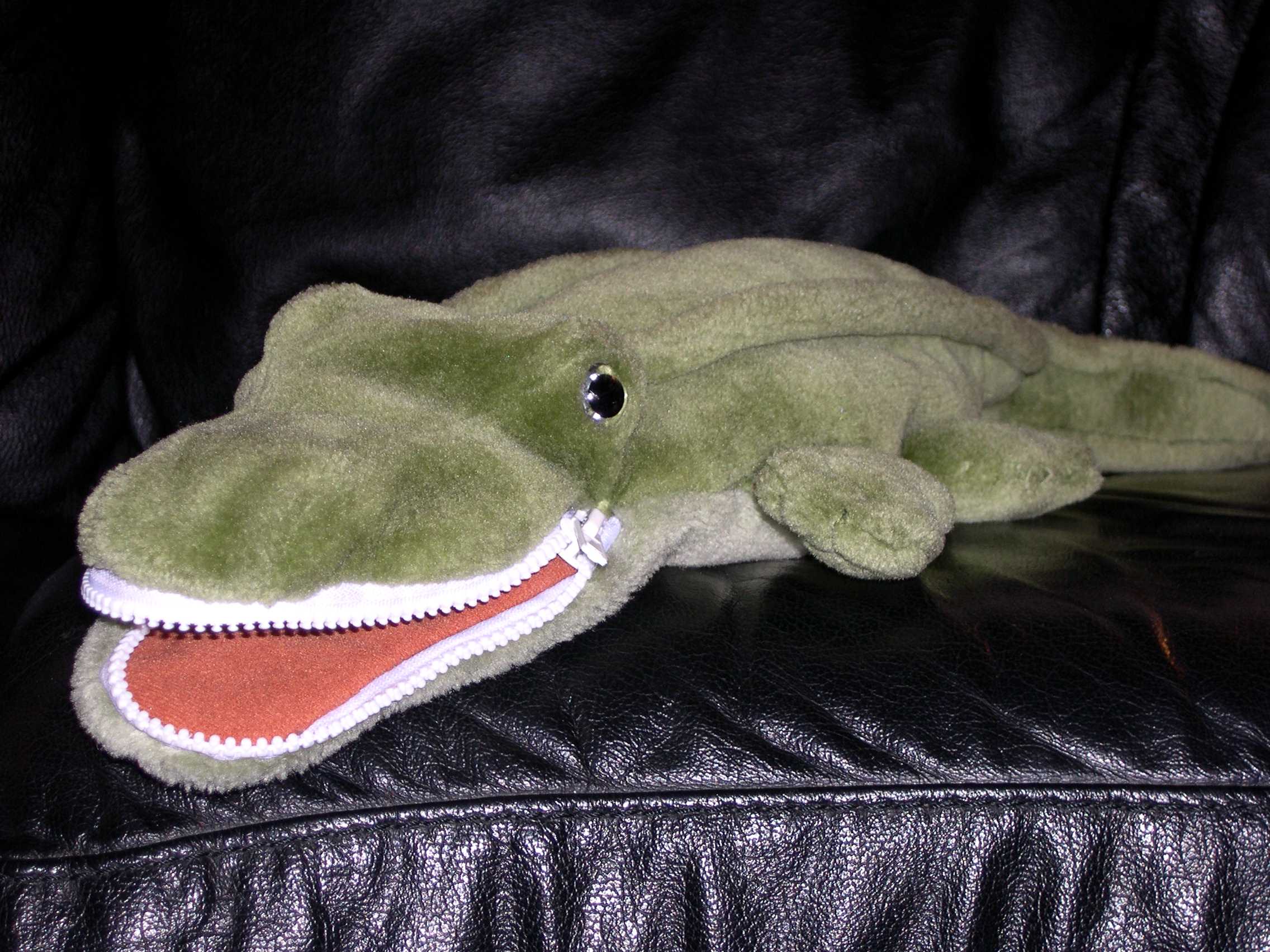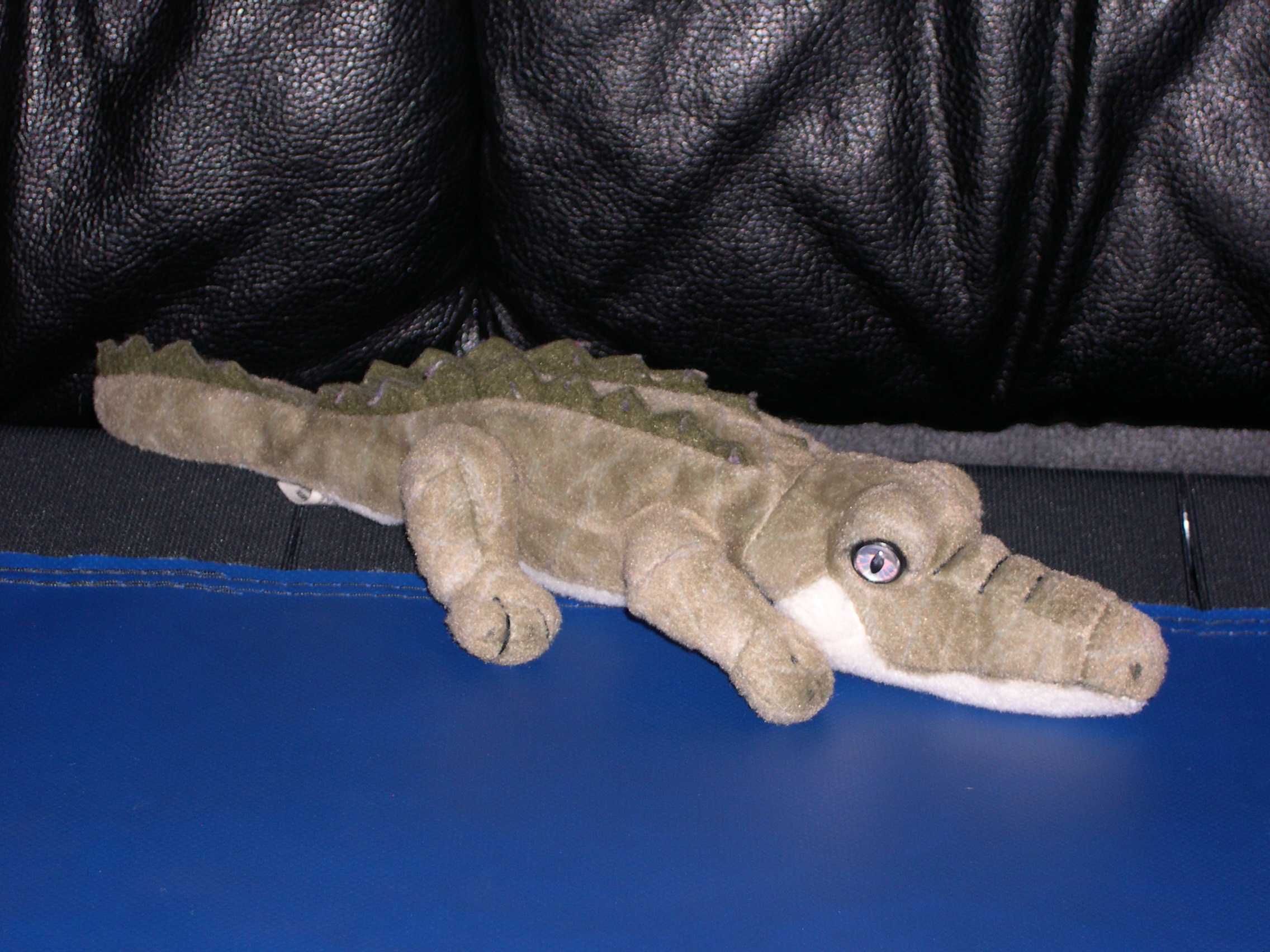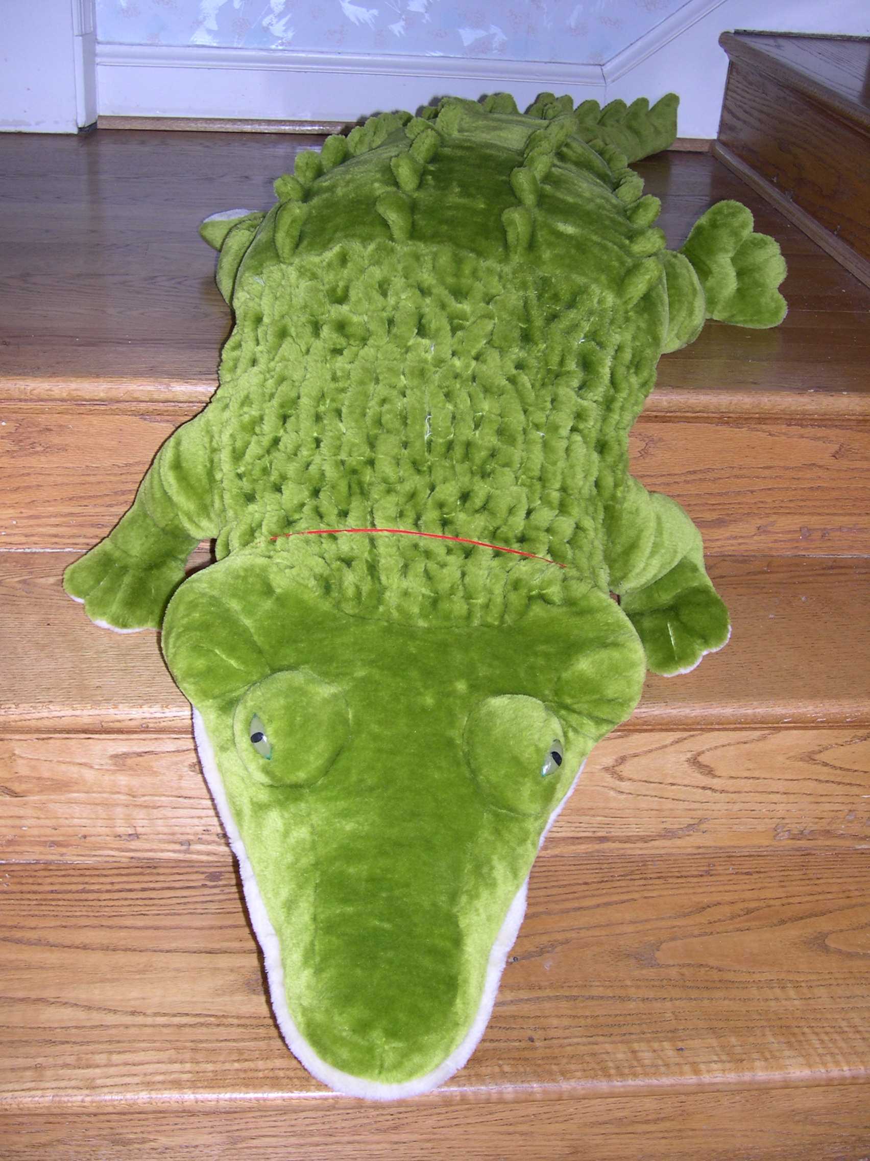 Big Alligator Big Alligator was found wandering around Costco one day. People were afraid of him. Mommy brought him home so that he would have some friends like Cheetah, Meow, White, White Bear and the many other alligators in the house. Big Alligator is really a nice alligator and gives other animals rides when they want one. Big Alligator is a teacher at Dog School. He is continuing his education at night at the O.B. (“Older Bed Animal”) levels in Dog School. |